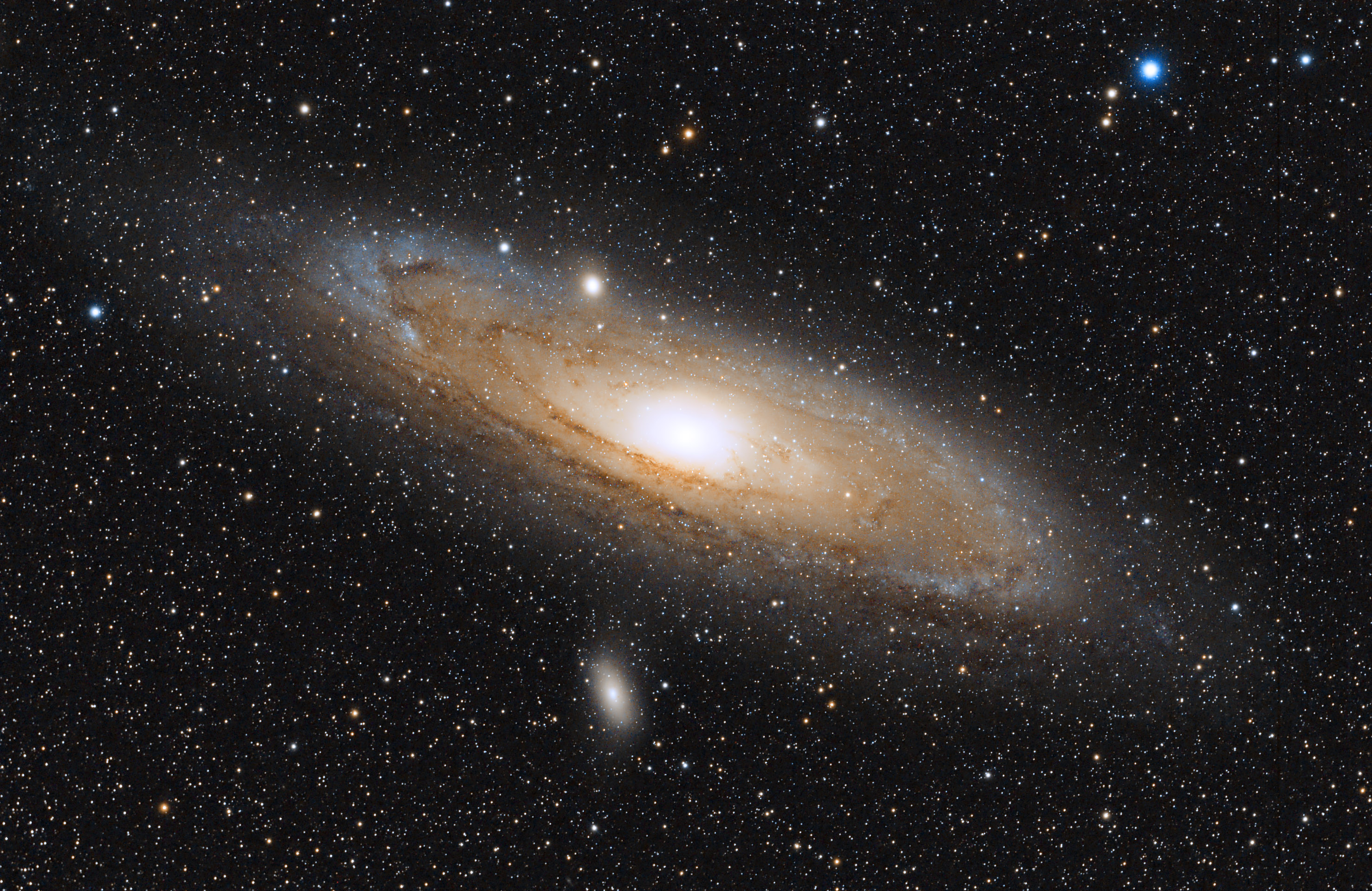 Bild2: Hier habe ich den Blaukanal in den äußeren Regionen noch ein wenig aufgezogen. Auf anderen Bildern von M31 ist der äußere Teil ja auch eher blau gefärbt. Warum schon bei meinen Rohbildern so wenig blau vorhanden ist, weiß ich leider nicht.